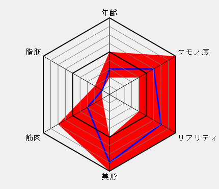 このサイトの獣人・竜人の傾向グラフ ・赤領域:取り扱う範囲 ・青線 :管理人の好み ![]() 上の「ケモノ指向グラフ」は当サイトにて作成することができます。 作成したグラフは自由にご使用ください。 左のフレームより「ケモノ指向グラフ作成」にお進みください! |